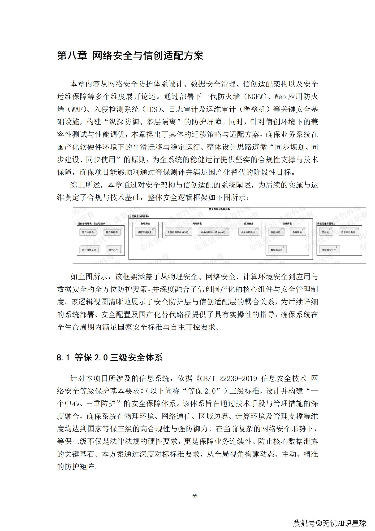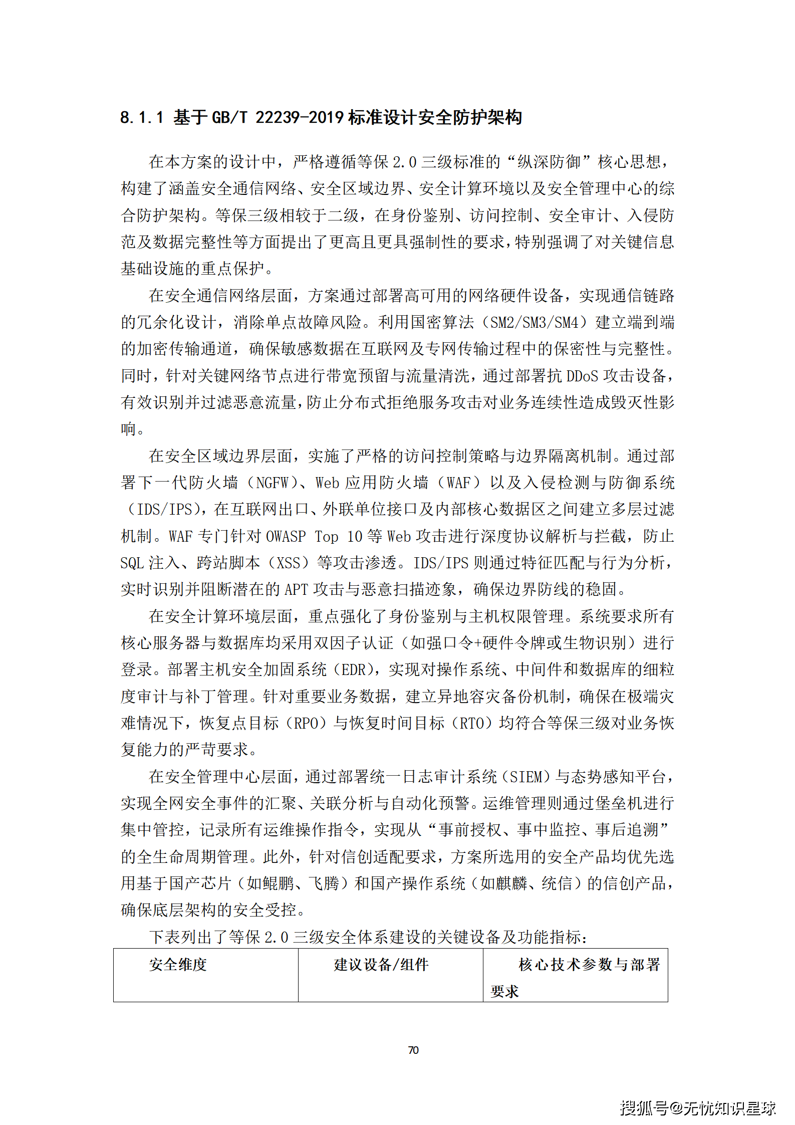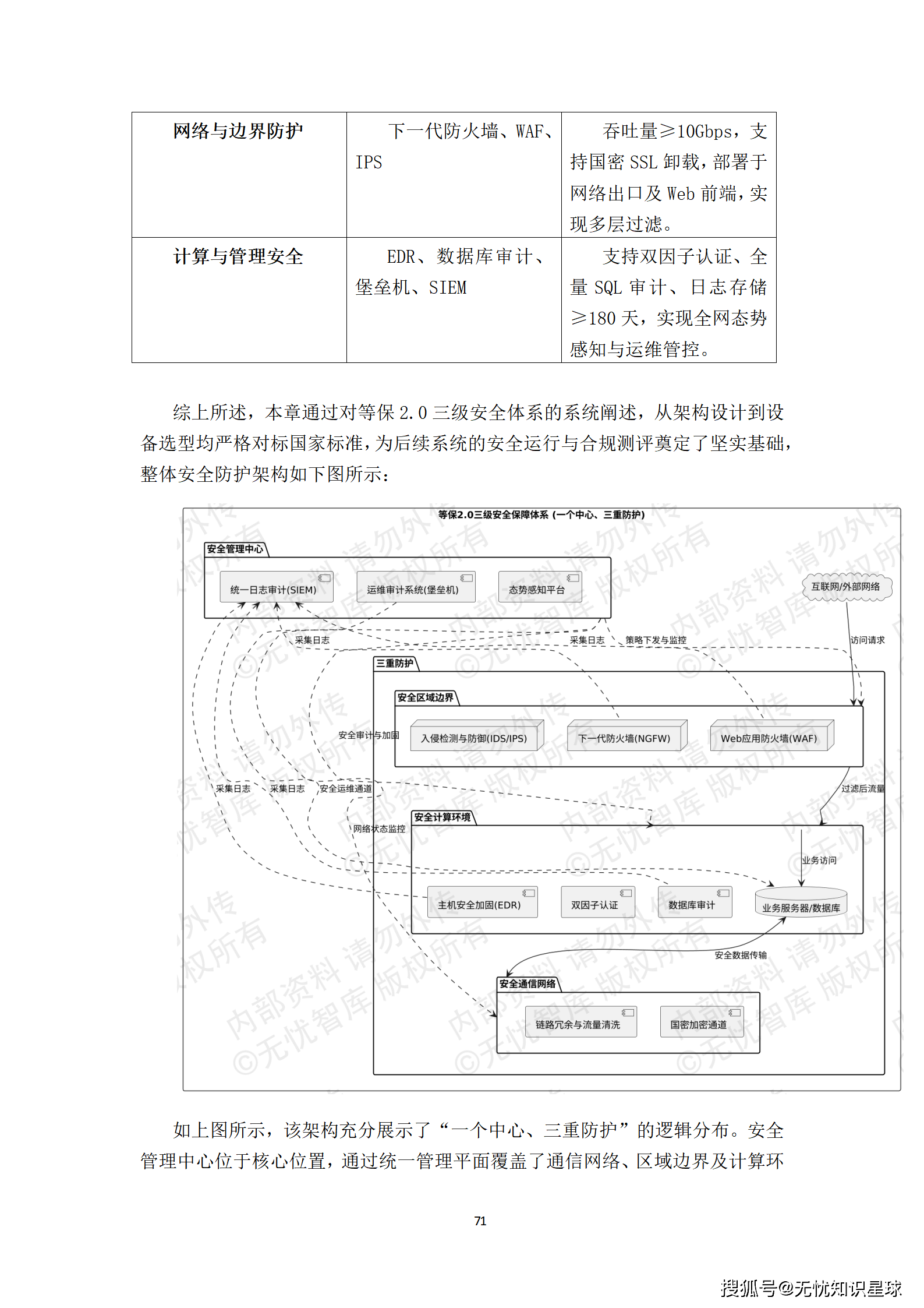 - 等保2.0三级防护:构建"一个中心、三重防护"体系。部署下一代防火墙、WAF、IDS、堡垒机及日志审计系统。