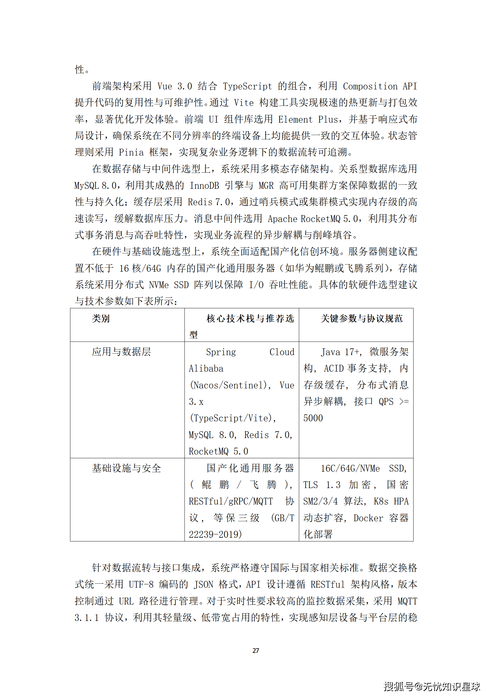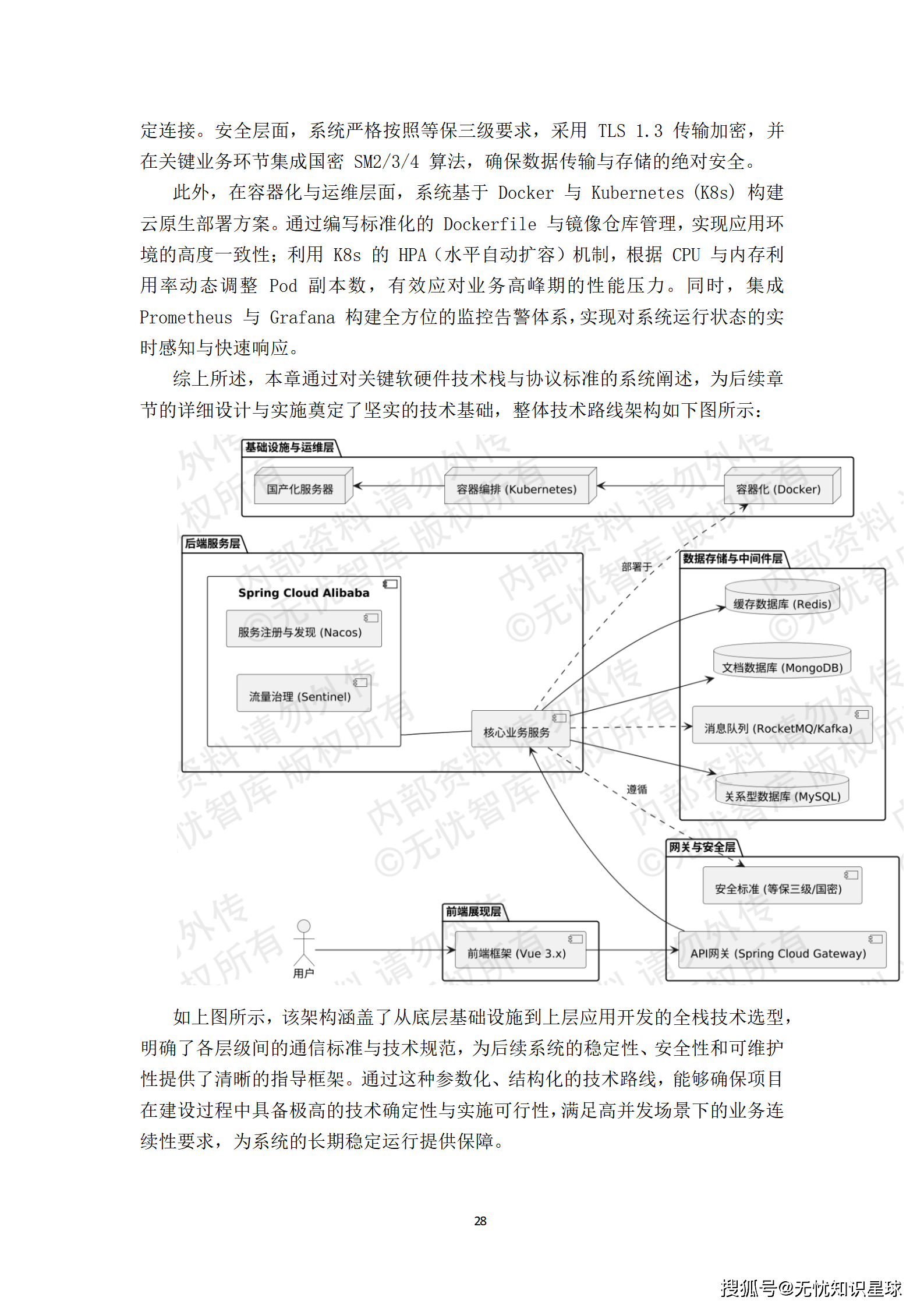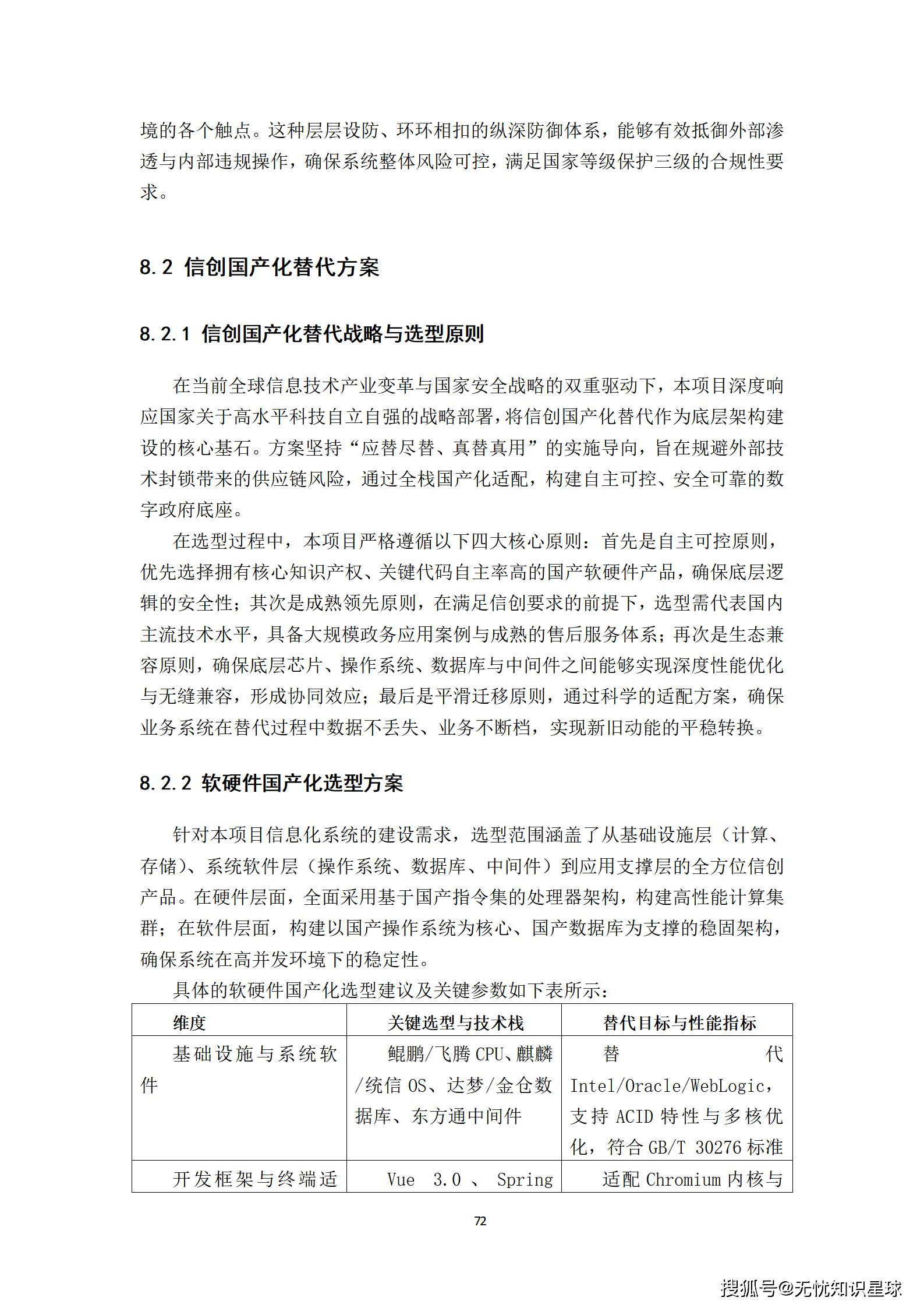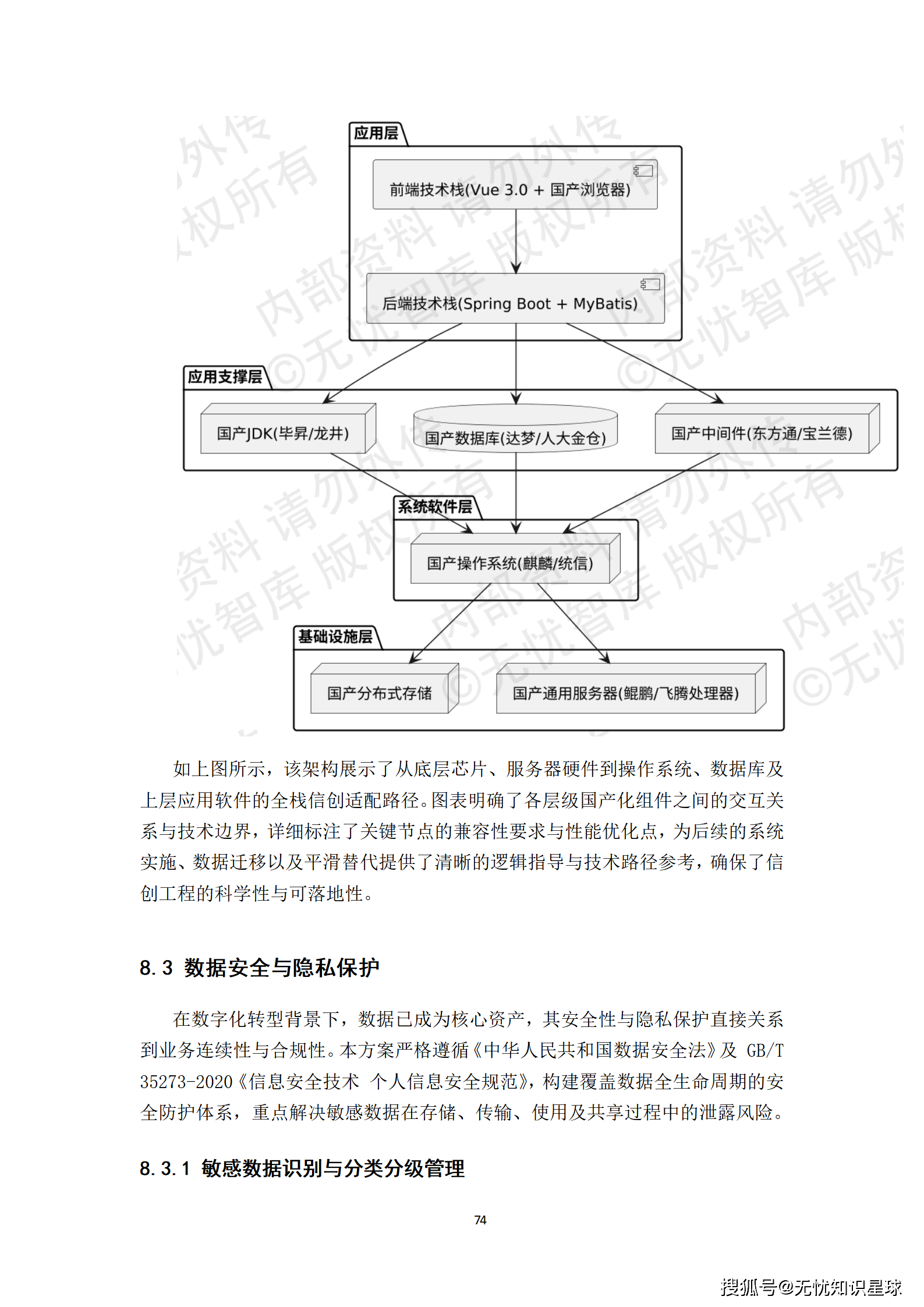 - 全栈国产化:基础设施采用鲲鹏/飞腾CPU,操作系统选用麒麟/统信,数据库使用达梦/金仓,中间件采用东方通。确保核心技术自主可控。