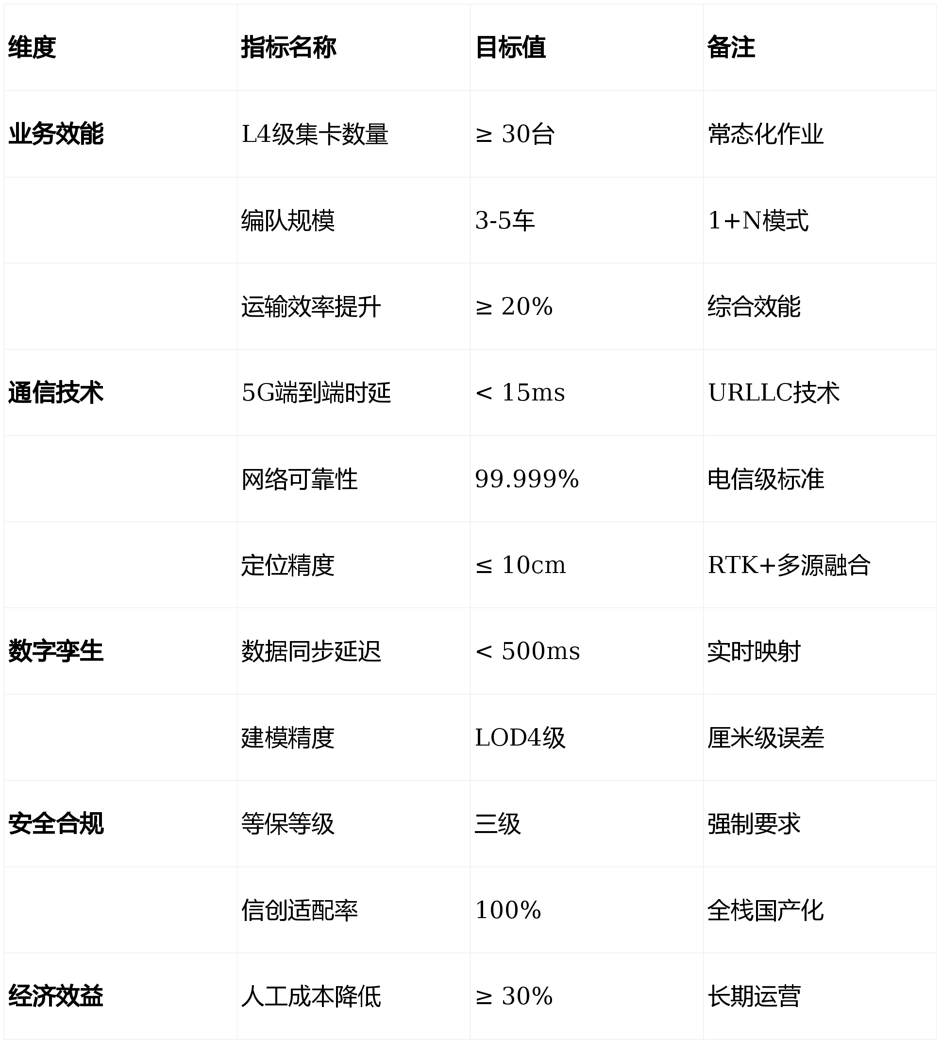 - 业务效能:L4级集卡≥30台,编队运行常态化,水平运输效率提升≥20%。