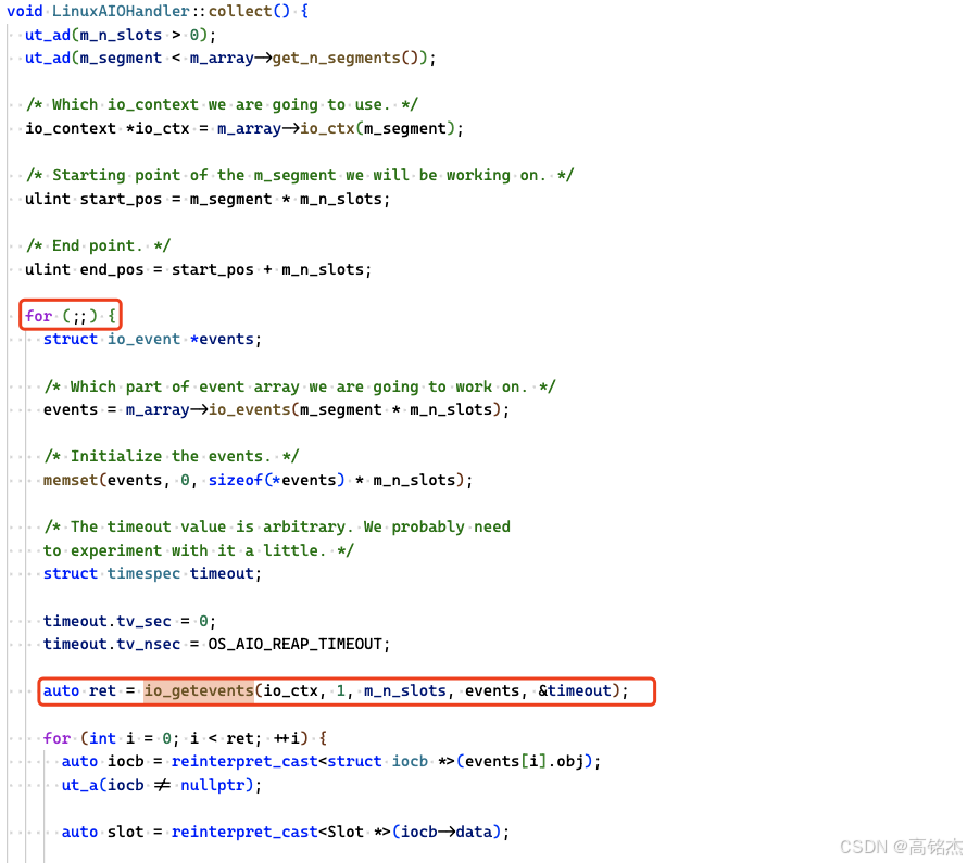 io_getevents,这个函数不是阻塞的,可以配置最少等几个好了就返回。MySQL 的策略是至少等1个完成,但最多等500ms。如果500ms内没有任何请求完成,返回0,外层for(;;)循环重新调用。os0file.cc:2334