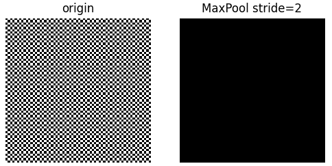 原始图片高密度的黑白黑白交替,因此是一个非常高频的图片,使用maxpool之后,所有的高频信号都折叠到了低频,导致maxpool只有的图片,骤然变成一个非常低频的图片,完全丧失了高频信息(细节)