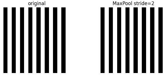 maxpool时,是每次采样要跳过stride个像素,当stride=2时,我们希望,这次采样落到A黑条上,下次采样要落到B黑条上,这样高频保留了,所以黑条纹的宽度>= 2xstride,也可以这样理解,黑条越宽,表示越低频,黑条越窄,表示越高频,要想maxpoo满足奈奎斯特定理,就是不能有太多高频。