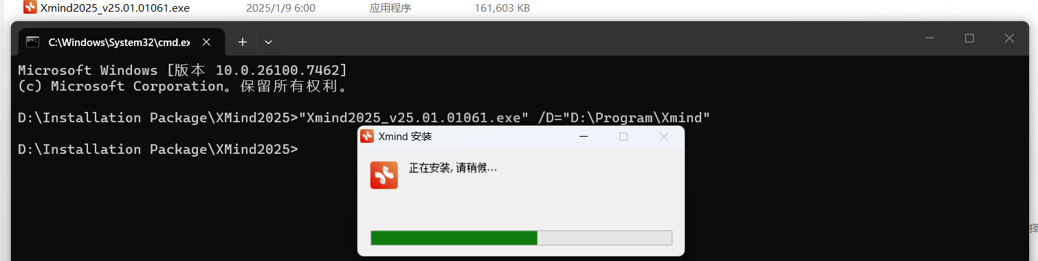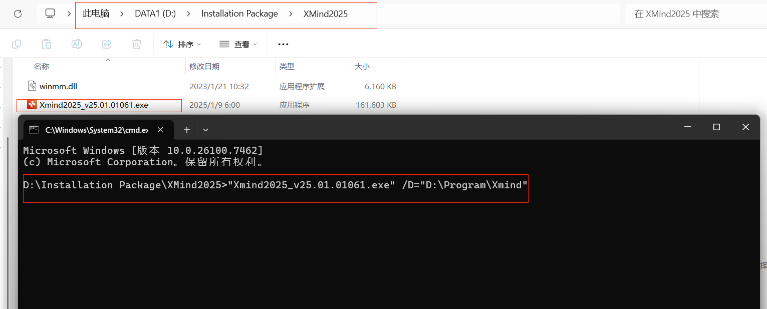如果要自定义安装路径(非C盘),可在安装包文件夹地址栏输入 cmd 并按回车键,然后在命令提示符中输入安装包名称 /D=目标路径(请提前创建目标路径)并按回车键。如下图所示(请确保使用英文输入法且无多余空格):