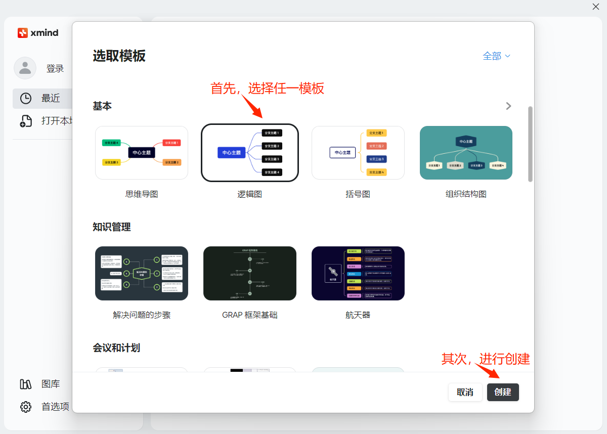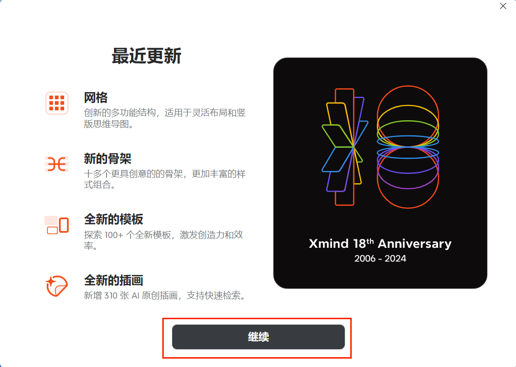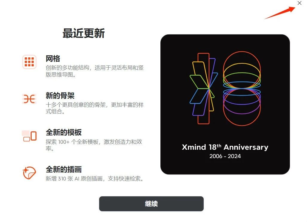 重新打开 Xmind 软件,点击"继续",如下图所示: