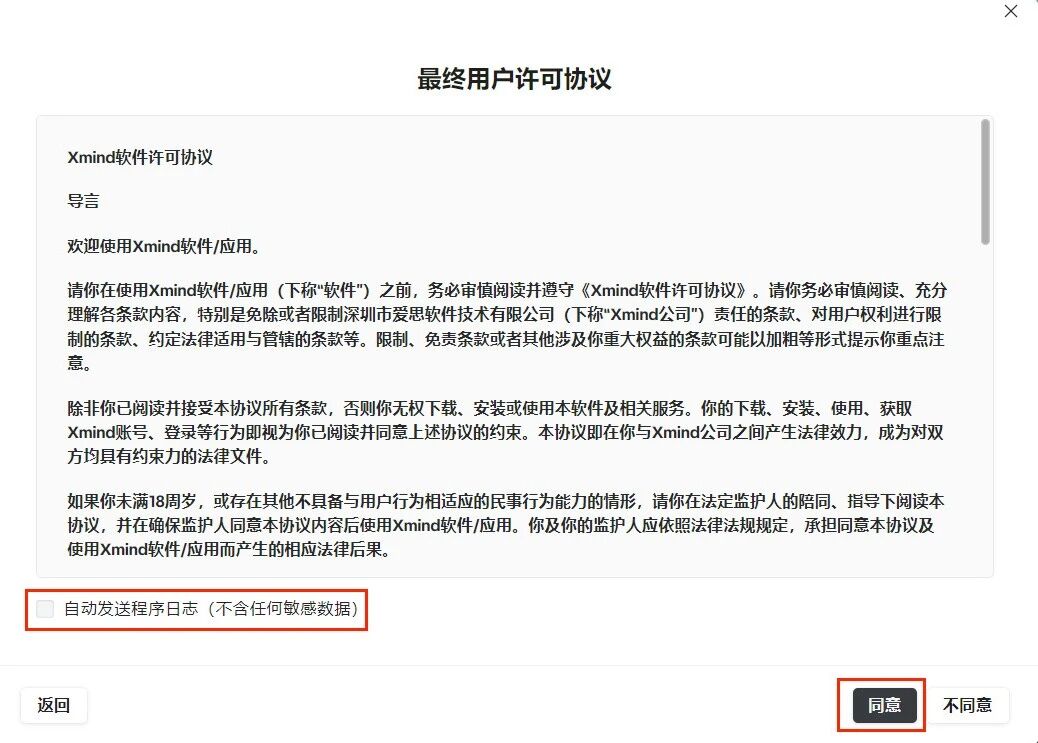 取消自动发送程序日志,然后点击"同意",如下图所示: