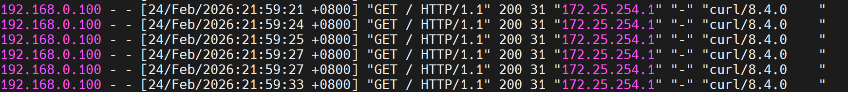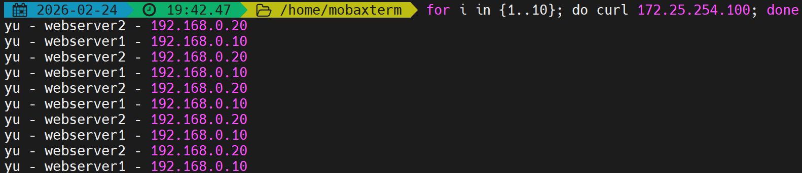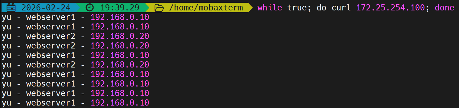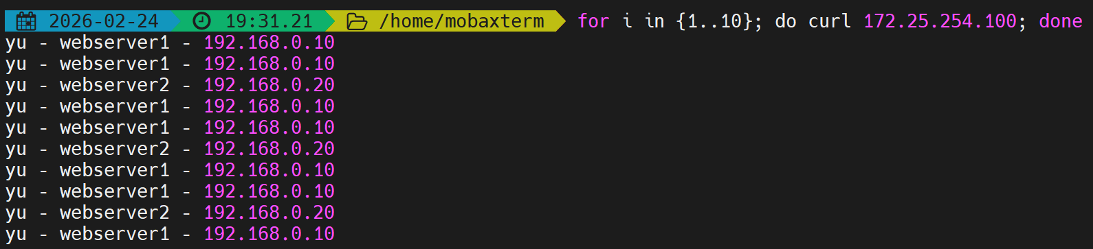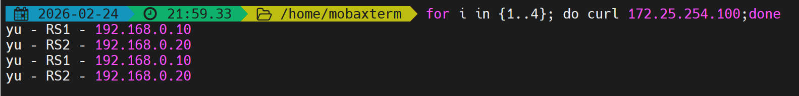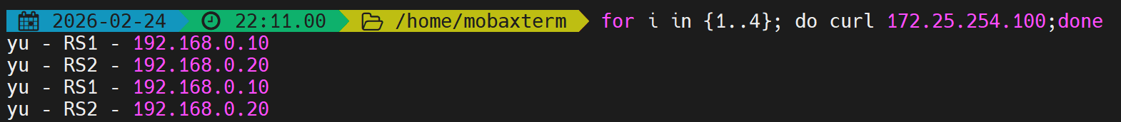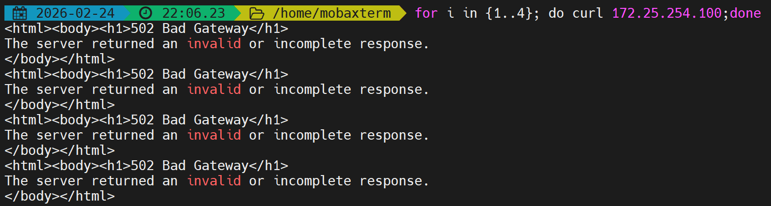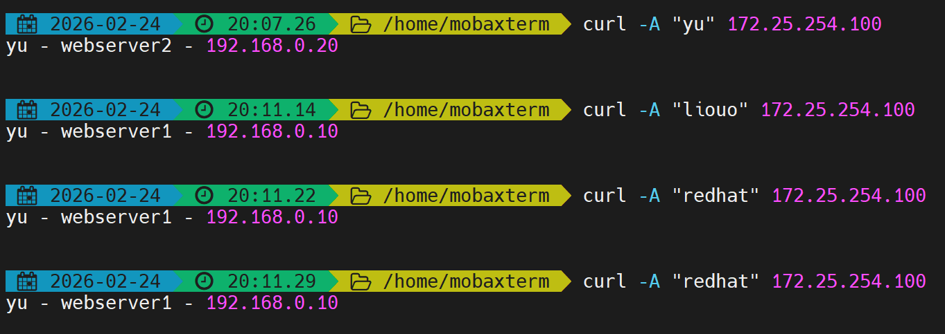 first会优先使用第一个服务器直到满载,测试并发数不足。 - 解决:开启多个终端同时压测,触发备用服务器。