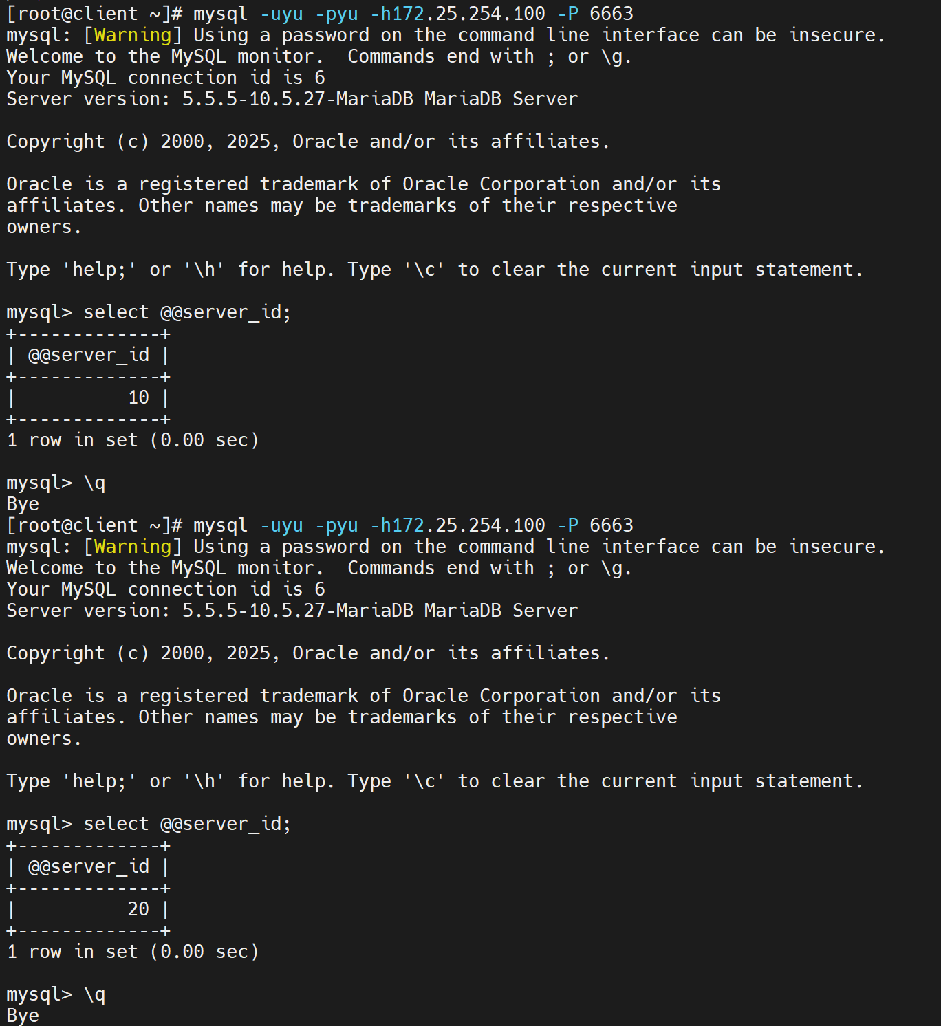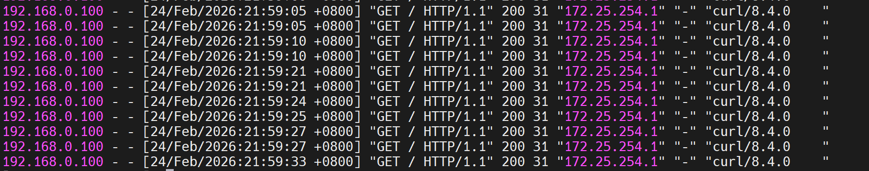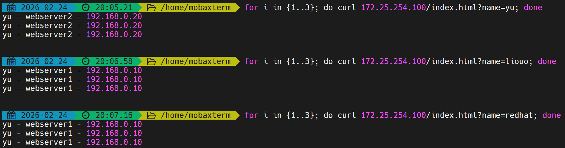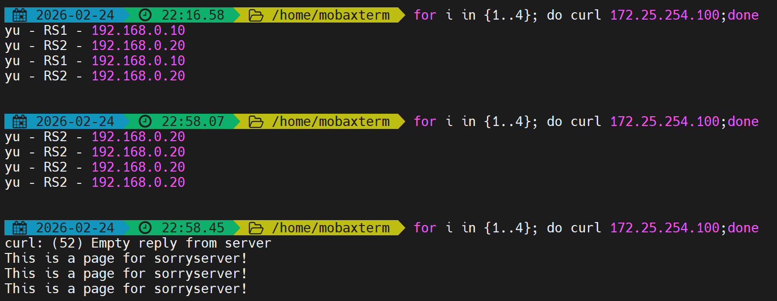first会优先使用第一个服务器直到满载,测试并发数不足。 - 解决:开启多个终端同时压测,触发备用服务器。