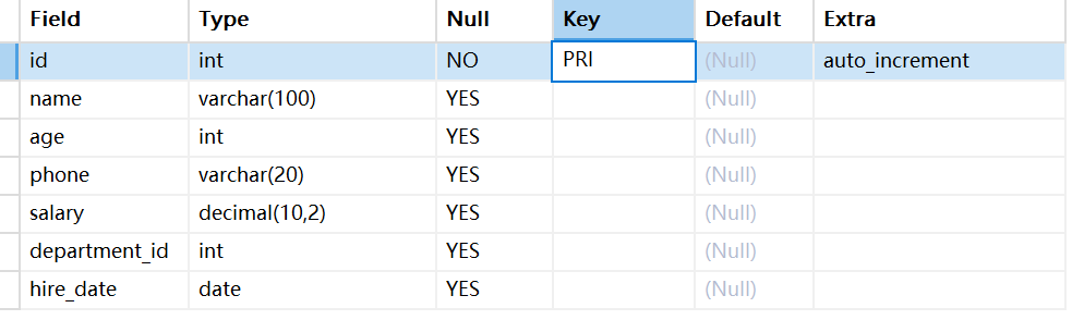 -- 创建员工表(不创建索引,只保留主键)