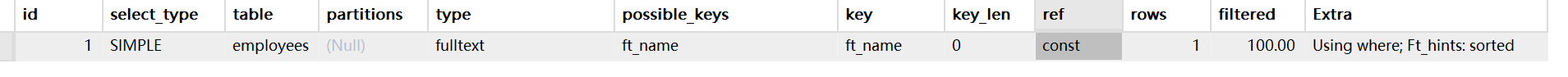 EXPLAIN SELECT * FROM employees WHERE MATCH(name) AGAINST('张' IN NATURAL LANGUAGE MODE);
