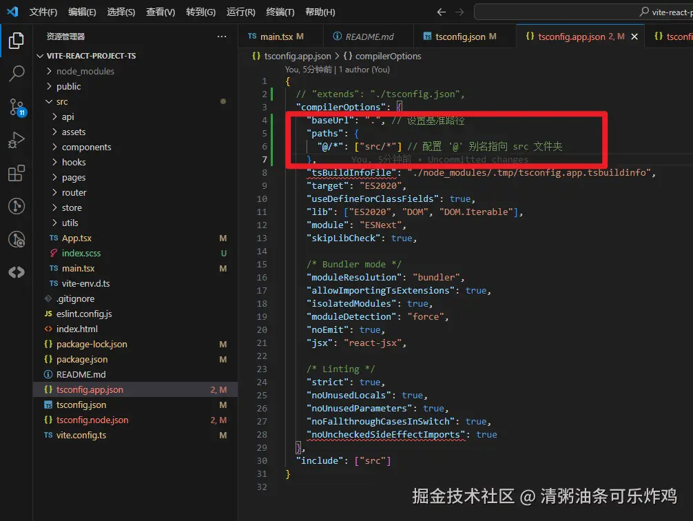 <font style="color:rgb(6, 6, 7);">tsconfig.json</font> 是项目的主配置文件,用于定义整个项目的 TypeScript 编译选项。:\ <font style="color:rgb(6, 6, 7);">tsconfig.app.json</font> 用于专门配置客户端应用代码。它扩展或覆盖了 <font style="color:rgb(6, 6, 7);">tsconfig.json</font> 中的设置,以满足应用代码的特定需求。例如,你可以在这里设置 <font style="color:rgb(6, 6, 7);">baseUrl</font> 和 <font style="color:rgb(6, 6, 7);">paths</font> 来定义路径别名\ <font style="color:rgb(6, 6, 7);">tsconfig.node.json</font> 用于配置 Node.js 环境中的 TypeScript,例如 Vite 的配置文件 <font style="color:rgb(6, 6, 7);">vite.config.ts</font>。它确保在 Node.js 环境中运行的代码(如构建脚本)使用正确的编译选项