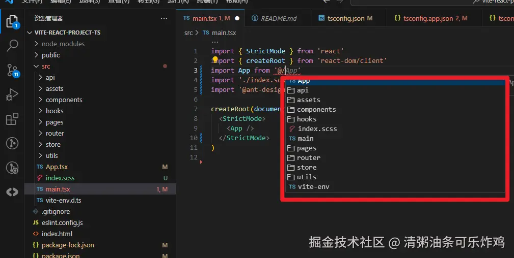 配置别名分为两种配置,1.项目支持使用@符号代表src 2.让vscode编辑器支持输入@符号时有下一个目录的提示