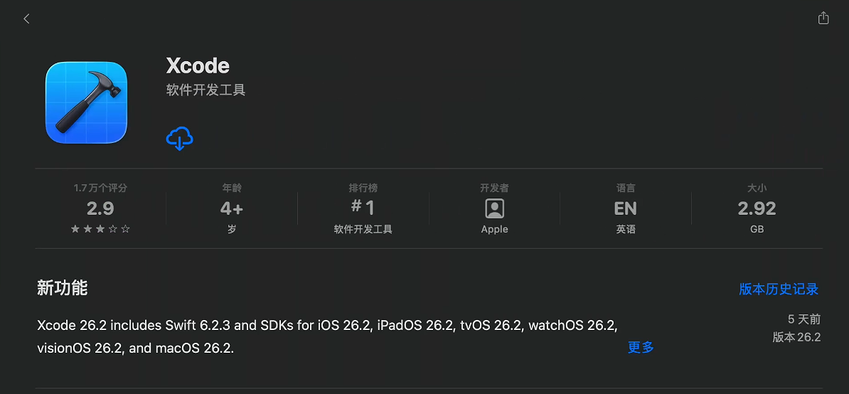 - 如果你运行的是 macOS 15.6,App Store 会提供 Xcode 26 系列