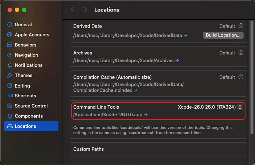 Xcode → Settings(macOS Ventura 及以后) - 或: