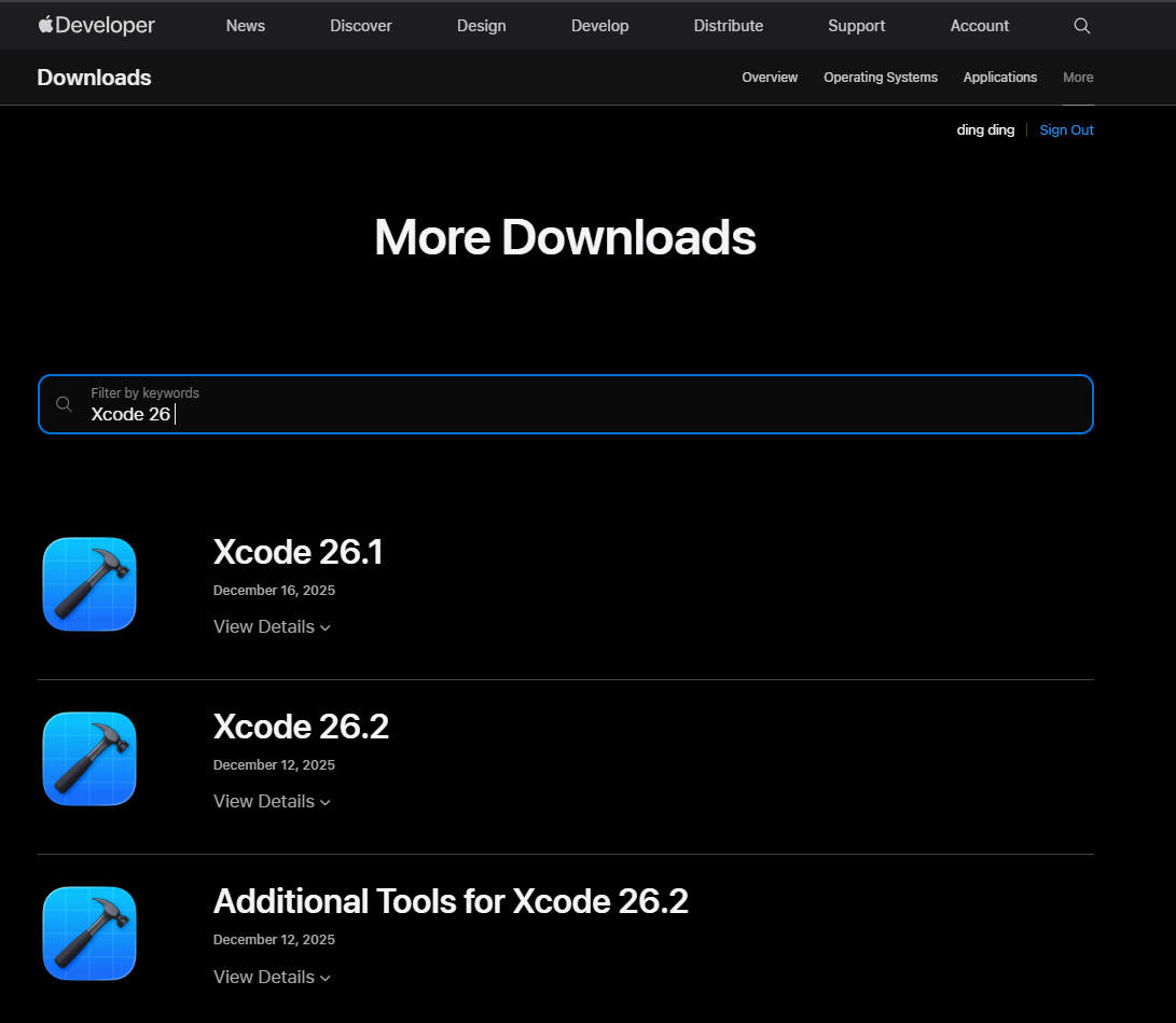 - 浏览列表找到确切的版本号,比如 "Xcode 26.1"