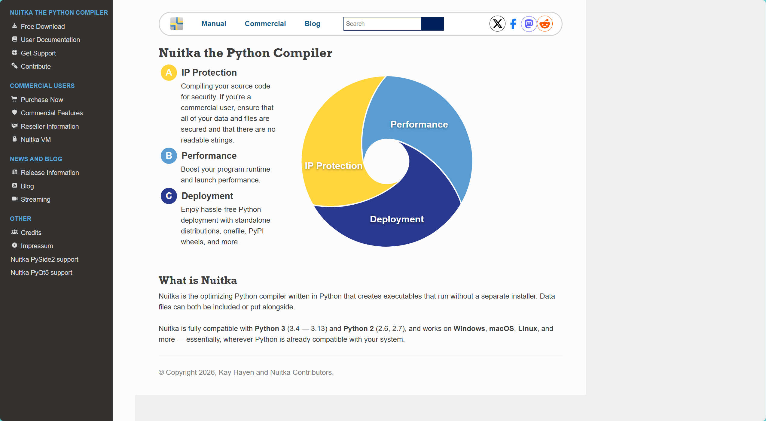 | 运行性能 | 标准 Python 速度,没有任何提升。 | 翻译成 C 后,部分逻辑(尤其是循环、运算)有显著的性能提升。 | 🏆 Nuitka |