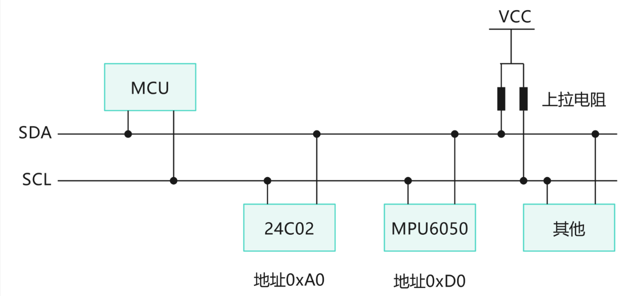 - 主机(MCU)和从机之间组成一个I2C通信总线,总线由两根线组成:SCL时钟线和SDA数据线。