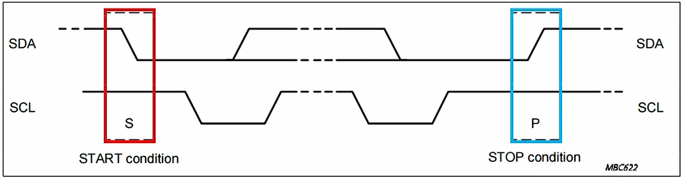 - 此期间SDA发生跳变,仅用于传递起始/停止信号(而非数据)。
