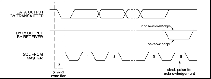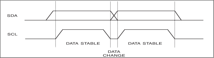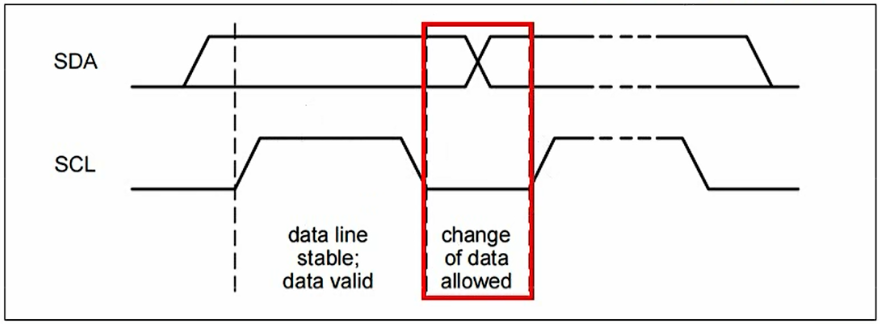 I2C协议规定:必须在SCL为高电平期间读取SDA的数据才有效。SCL为低电平时改变SDA上的数据(SCL为高电平时不能改变SDA,否则不是有效数据,可能错误的识别为开始信号或终止信号)。