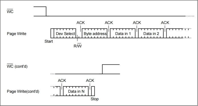 一次性写入多个字节的操作,称为页写入(Page Write)。M24C02每页有16个字节,每次写操作能写入单独的一个页中,所以一次性最多可以写入16个字节。当一次性写入超过16个字节的时候,超过的部分会重新从这页的首地址重新写入。