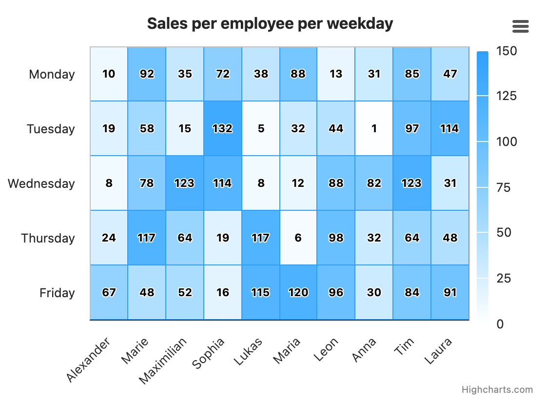 热图借鉴了 Highcharts 地图中的一个核心概念------颜色轴。有关详细信息,请参阅关于 颜色轴color axis 的文档。