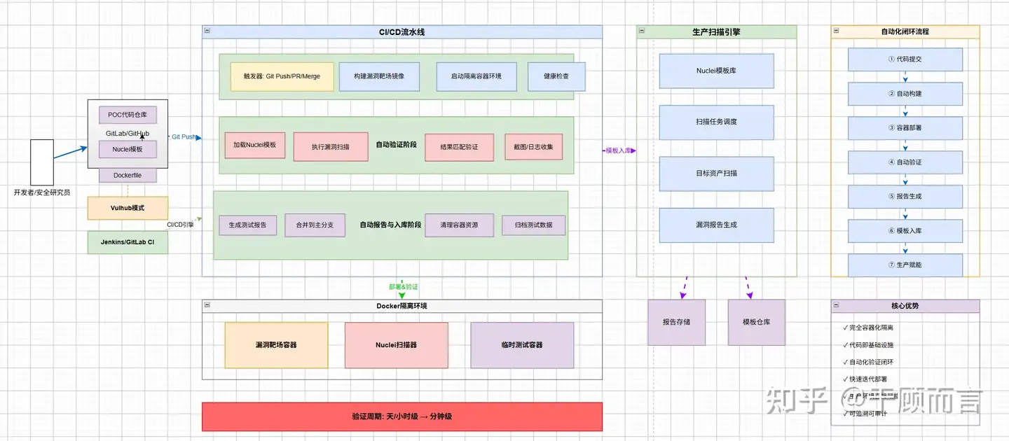 - 环境标准化与容器化:参考 Vulhub 等优秀实践,将每个需要验证的漏洞环境封装为 Docker 镜像。将 Nuclei 模板文件与其对应的测试环境 Dockerfile 一同进行版本管理,实现"环境即代码"。