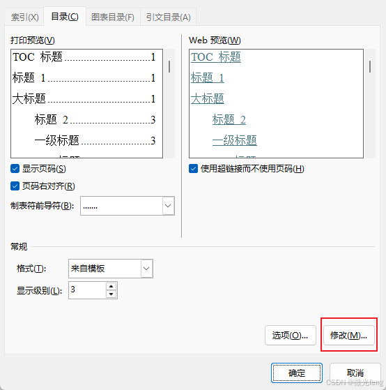 问题二是三级标题页码没有右对齐,解决方法是修改TOC3的样式为右对齐