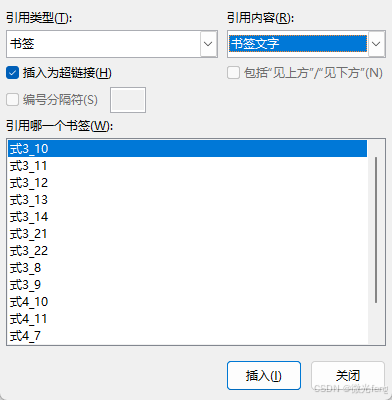 插入引用时,引用类型选择书签,引用内容选择书签文字。