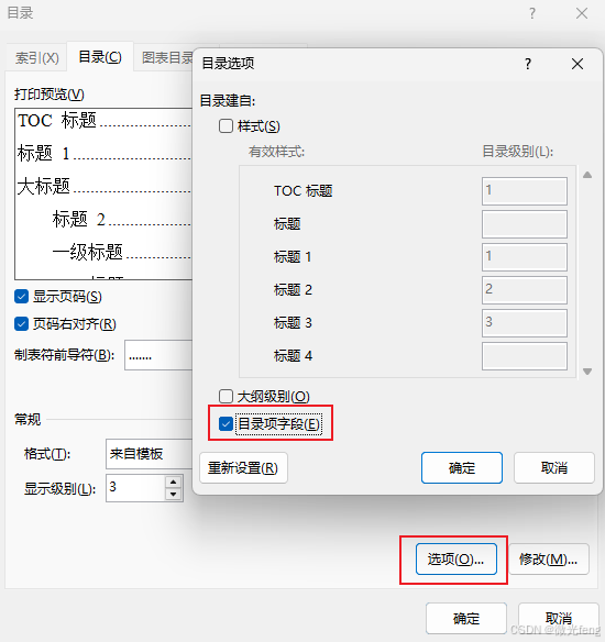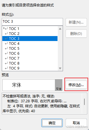 此时会出现两个问题,问题一是目录字体会自动跟随标题字体,如果手动修改会在更新域后失效,解决方法是修改TOC的字体,在自定义目录中点击修改