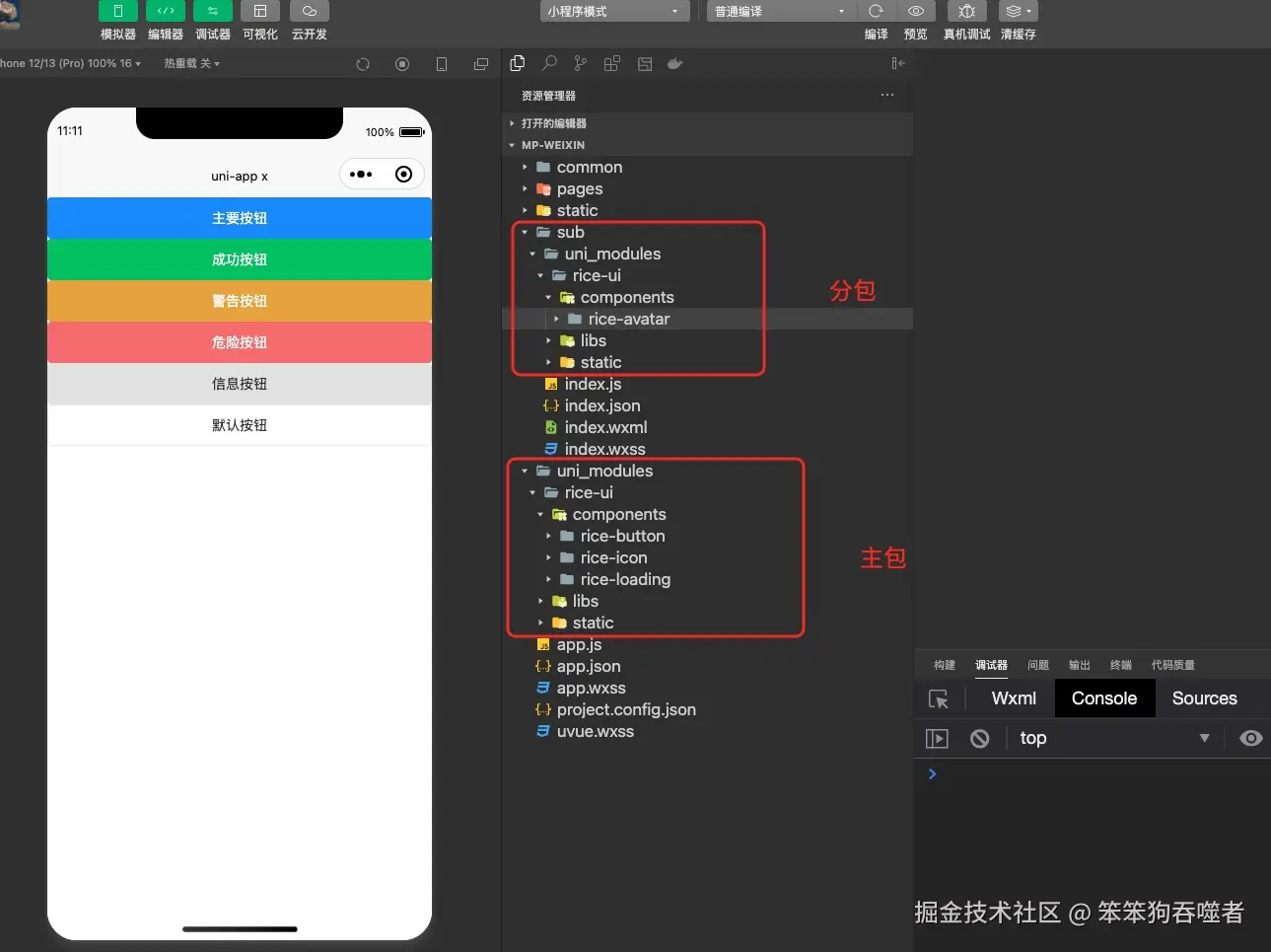 这样,分包用组件就写 sub-rice-avatar,主包就是 rice-button
