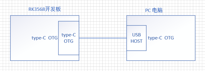 使用配套赠送的 USB Type-C 连接线连接 OTG 接口到 PC(电脑), USB Type-C 线会将 CC1 和 CC2 拉高,因此 USB3_OTG0_ID 线为高,表示 OTG 工作在从机模式