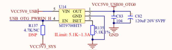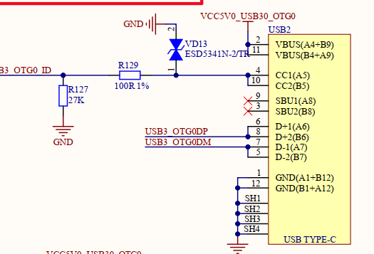 如果要使用 OTG 的 HOST 功能,那么必须要使用到 Type-c OTG 先。Type-C OTG 线会将 CC1 和 CC2 拉低,因此 USB3_OTG0_ID 线为低,表示 OTG 工作在主机模式。 USB3_OTG0_ID 默认为低电平