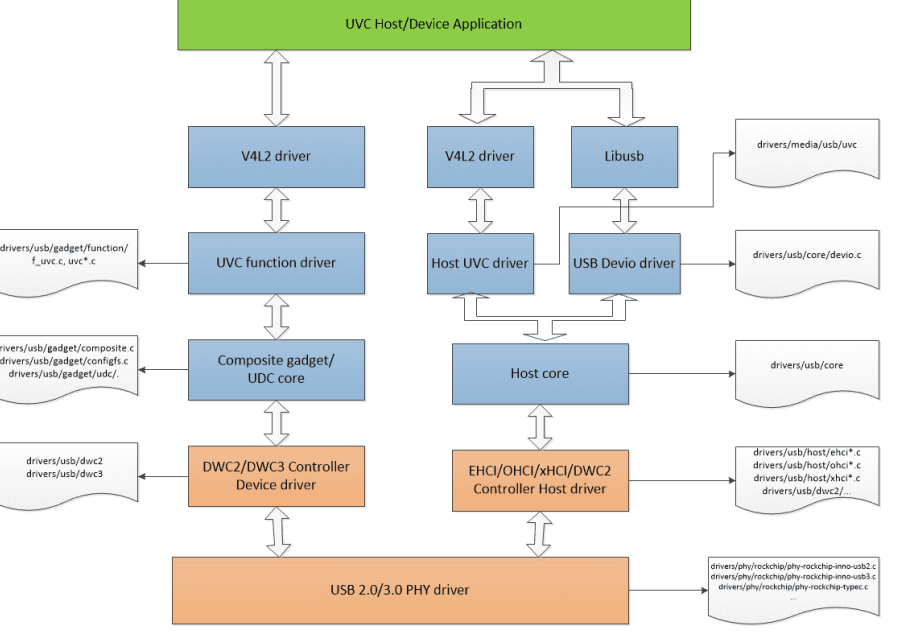 在 Linux 系统中,提供了主机侧和设备侧视角的 USB 驱动框架及通用驱动程序。主机侧分为 USB Core、HOST 控制器驱动,HUB 驱动和各设备类驱动。设备侧分为 Gadget 框架、Devices 控制器驱动和各设备类 Function 驱动