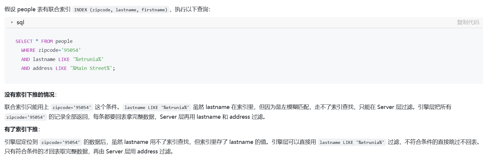 - 如果有 ICP: 引擎发现这 1000 条索引里已经包含了 lastname 这一列的值。虽然 %etrunia% 这种左模糊没法用来"定位"范围,但在**已经定位好的范围里做"内存过滤"**是可以的!