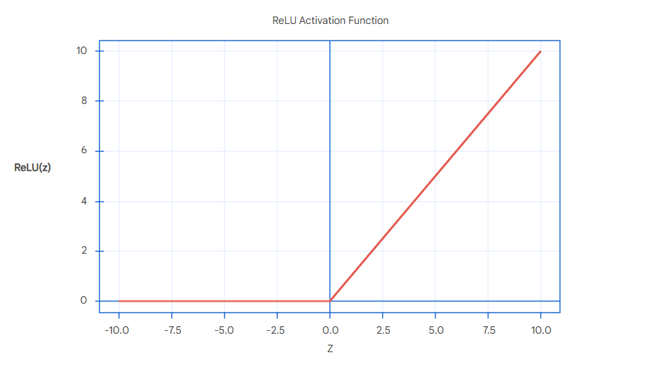 ReLU(z)={0if z≤0zif z>0 \text{ReLU}(z) = \begin{cases} 0 & \text{if } z \leq 0 \\ z & \text{if } z > 0 \end{cases} ReLU(z)={0zif z≤0if z>0