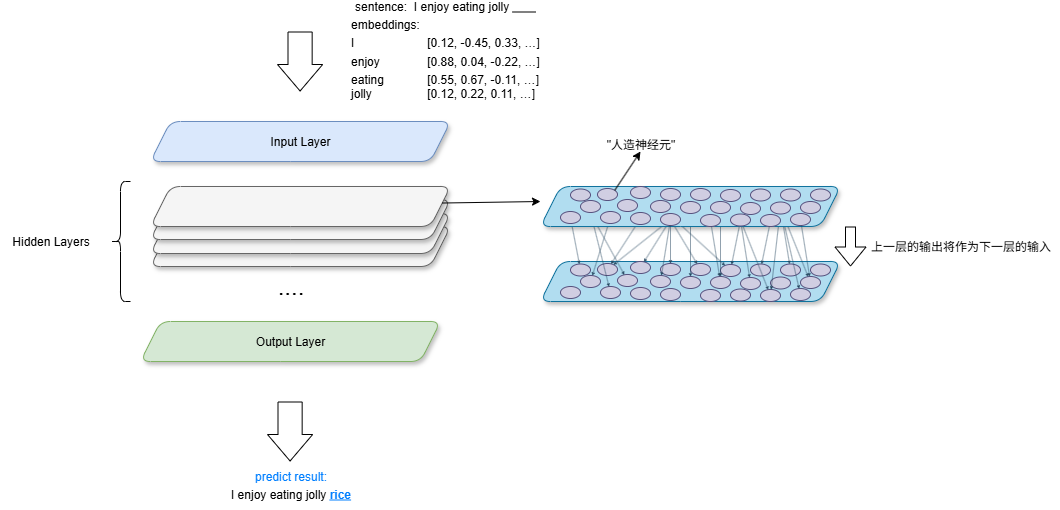 在隐藏层层级中,每一层都会有若干个"人造神经元",同一层的神经元相互独立,独立接收来自上一层的输出,然后进行计算,输出到下一层的神经元