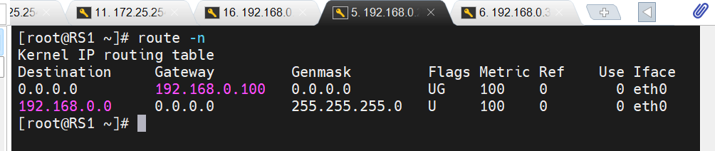 root@client \~\]# nmcli connection reload \[root@client \~\]# nmcli connection up eth0 连接已成功激活(D-Bus 活动路径:/org/freedesktop/NetworkManager/ActiveConnection/5) \[root@client \~\]# route -n Kernel IP routing table Destination Gateway Genmask Flags Metric Ref Use Iface 0.0.0.0 172.25.254.100 0.0.0.0 UG 100 0 0 eth0 172.25.254.0 0.0.0.0 255.255.255.0 U 100 0 0 eth0 #### 检测 \[root@client \~\]# ping 192.168.0.200 PING 192.168.0.200 (192.168.0.200) 56(84) 比特的数据。 64 比特,来自 192.168.0.200: icmp_seq=1 ttl=128 时间=1.08 毫秒 #### 5.RS1 \[root@RS1 \~\]# vmset.sh eth0 192.168.0.10 RS1 noroute \[root@RS1 \~\]# nmcli connection modify eth0 ipv4.gateway 192.168.0.100 \[root@RS1 \~\]# nmcli connection reload \[root@RS1 \~\]# nmcli connection up eth0 \[root@RS1 \~\]# route -n Kernel IP routing table Destination Gateway Genmask Flags Metric Ref Use Iface 0.0.0.0 192.168.0.100 0.0.0.0 UG 100 0 0 eth0 192.168.0.0 0.0.0.0 255.255.255.0 U 100 0 0 eth0 在lo上设定vip \[root@RS1 \~\]# cd /etc/NetworkManager/system-connections/ \[root@RS1 system-connections\]# cp -p eth0.nmconnection lo.nmconnection \[root@RS1 system-connections\]# vim lo.nmconnection \[connection