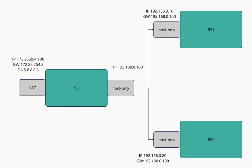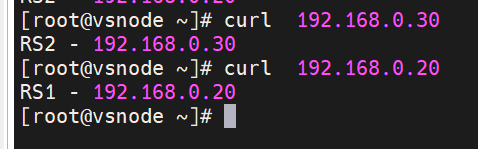 root@vsnode \~\]# vmset.sh eth0 172.25.254.100 vsnode \[root@vsnode \~\]# vmset.sh eth1 192.168.0.100 vsnode noroute ### **2.RS1** 设定网络 \[root@RS1 \~\]# vmset.sh eth0 192.168.0.20 RS1 noroute \[root@RS1 \~\]# nmcli connection modify eth0 ipv4.gateway 192.168.0.100 \[root@RS1 \~\]# nmcli connection reload \[root@RS1 \~\]# nmcli connection up eth0 \[root@RS1 \~\]# route -n Kernel IP routing table Destination Gateway Genmask Flags Metric Ref Use Iface 0.0.0.0 192.168.0.100 0.0.0.0 UG 100 0 0 eth0 192.168.0.0 0.0.0.0 255.255.255.0 U 100 0 0 eth0 设定访问业务真实数据 \[root@RS1 \~\]# dnf install httpd -y \[root@RS1 \~\]# systemctl enable --now httpd \[root@RS1 \~\]# echo RS1 - 192.168.0.20 \> /var/www/html/index.html ### **3.RS2** #设定网络 \[root@RS1 \~\]# vmset.sh eth0 192.168.0.30 RS1 noroute \[root@RS1 \~\]# nmcli connection modify eth0 ipv4.gateway 192.168.0.100 \[root@RS1 \~\]# nmcli connection reload \[root@RS1 \~\]# nmcli connection up eth0 \[root@RS1 \~\]# route -n Kernel IP routing table Destination Gateway Genmask Flags Metric Ref Use Iface 0.0.0.0 192.168.0.100 0.0.0.0 UG 100 0 0 eth0 192.168.0.0 0.0.0.0 255.255.255.0 U 100 0 0 eth0 设定访问业务真实数据 \[root@RS1 \~\]# dnf install httpd -y \[root@RS1 \~\]# systemctl enable --now httpd \[root@RS1 \~\]# echo RS2 - 192.168.0.30 \> /var/www/html/index.html ### **4.在vs主机中测试环境** \[root@vsnode \~\]# curl 192.168.0.20 RS1 - 192.168.0.20 \[root@vsnode \~\]# curl 192.168.0.30 RS2 - 192.168.0.30  ## 二、DR模式实验过程  ### 环境设定方式 #### 1.在路由器中 \[root@router \~\]# systemctl disable --now ipvsadm.service Removed "/etc/systemd/system/multi-user.target.wants/ipvsadm.service". \[root@router \~\]# ipvsadm -C \[root@router \~\]# vmset.sh eth0 172.25.254.100 vsnode \[root@router \~\]# vmset.sh eth1 192.168.0.100 vsnode noroute、 设定内核路由功能 \[root@router \~\]# echo net.ipv4.ip_forward=1 \>\> /etc/sysctl.conf \[root@router \~\]# sysctl -p net.ipv4.ip_forward = 1 数据转发策略 \[root@router \~\]# iptables -t nat -A POSTROUTING -o eth1 -j SNAT --to-source 192.168.0.100 \[root@vsnode \~\]# iptables -t nat -A POSTROUTING -o eth0 -j SNAT --to-source 172.25.254.100 #### 2.vsnode 调度器 \[root@vsnode \~\]# vmset.sh eth0 192.168.0.50 vsnode norouter \[root@vsnode \~\]# vim /etc/NetworkManager/system-connections/eth0.nmconnection \[connection