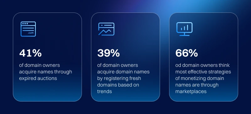 - 大多数域名所有者通过过期域名拍卖(41%)或根据趋势注册新域名(39%)来获取域名。