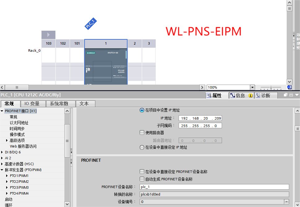 配置网关参数:选中Profinet转Ethernet IP网关网关设备,在右侧"属性"中,设置设备名称为"pns-eipm",IP地址为192.168.20.5(与PLC同网段,避免IP冲突)。