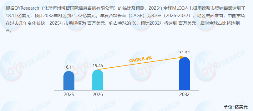 据QYResearch最新统计预测,2025年全球MLCC内电极用镍浆 市场销售额已达18.11亿美元,并有望在2032年攀升至31.32亿美元,2026至2032年间年复合增长率(CAGR)预计为8.3%。这一增长态势主要受国产替代加速与新能源汽车需求爆发的双重驱动。