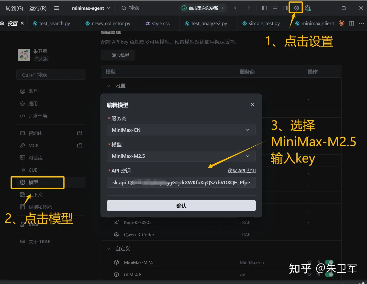 先搭建开发环境,去MiniMax开放平台上申请key,然后可以通过Python SDK或者Claude Code、Cursor、Trae等AI编程工具上进行配置。