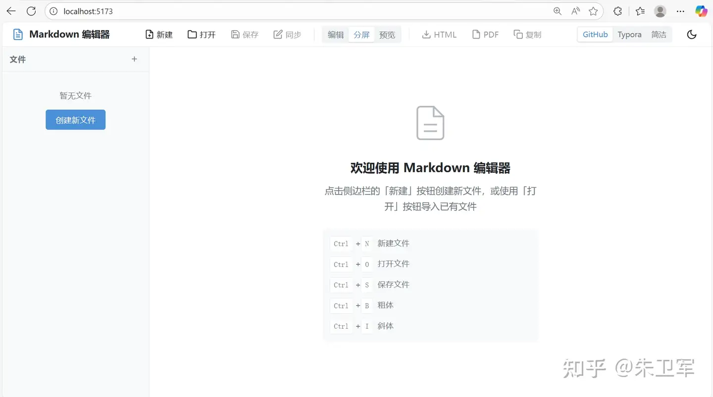 开发好后在浏览器通过http://localhost:5173/打开应用,就得到了一个简洁但使用的Markdown编辑器。