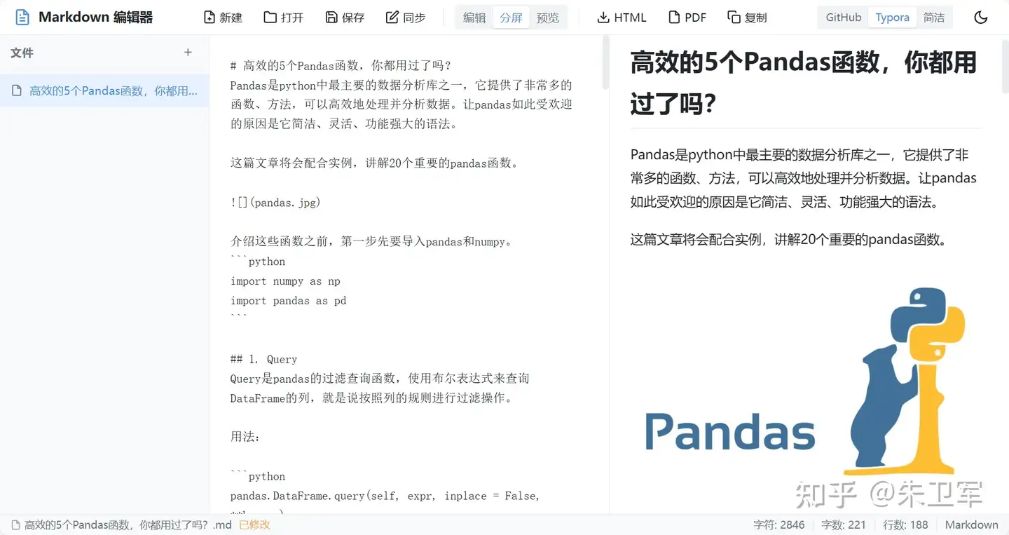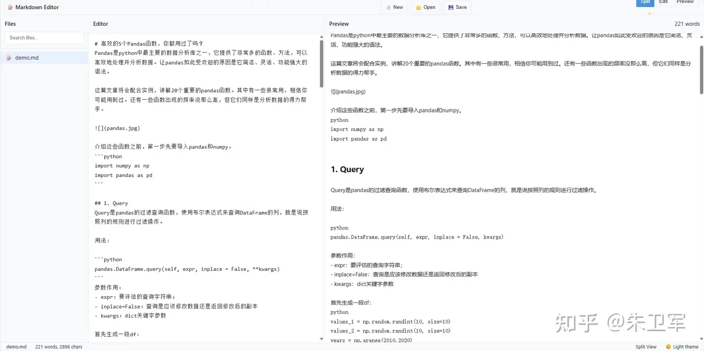 它支持创建md文件,并可以编辑、分屏(实时渲染)、预览、插入本地图片、导出PDF、明亮暗黑模式等,我后来还加上了切换Github、Typora UI风格、一键复制到公众号的功能,可以说满足了95%以上的Markdown写作需求。