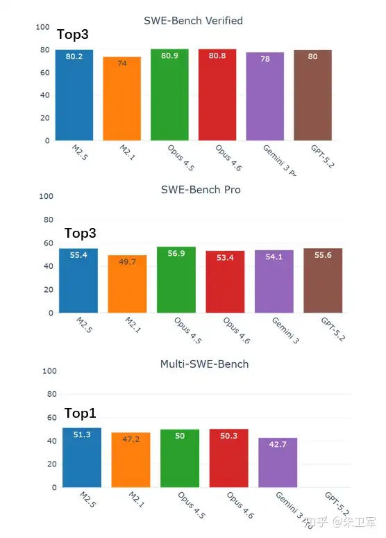 从最新的模型评测数据来看,M2.5在软件工程能力上表现得非常强,其中SWE-Bench Verified(验证后的软件工程能力)和SWE-Bench Pro(专业级软件工程能力)均排名第三,而Multi-SWE-Bench(多语言软件工程能力)则排名第一,力压Opus 4.6和Gemini3 Pro。