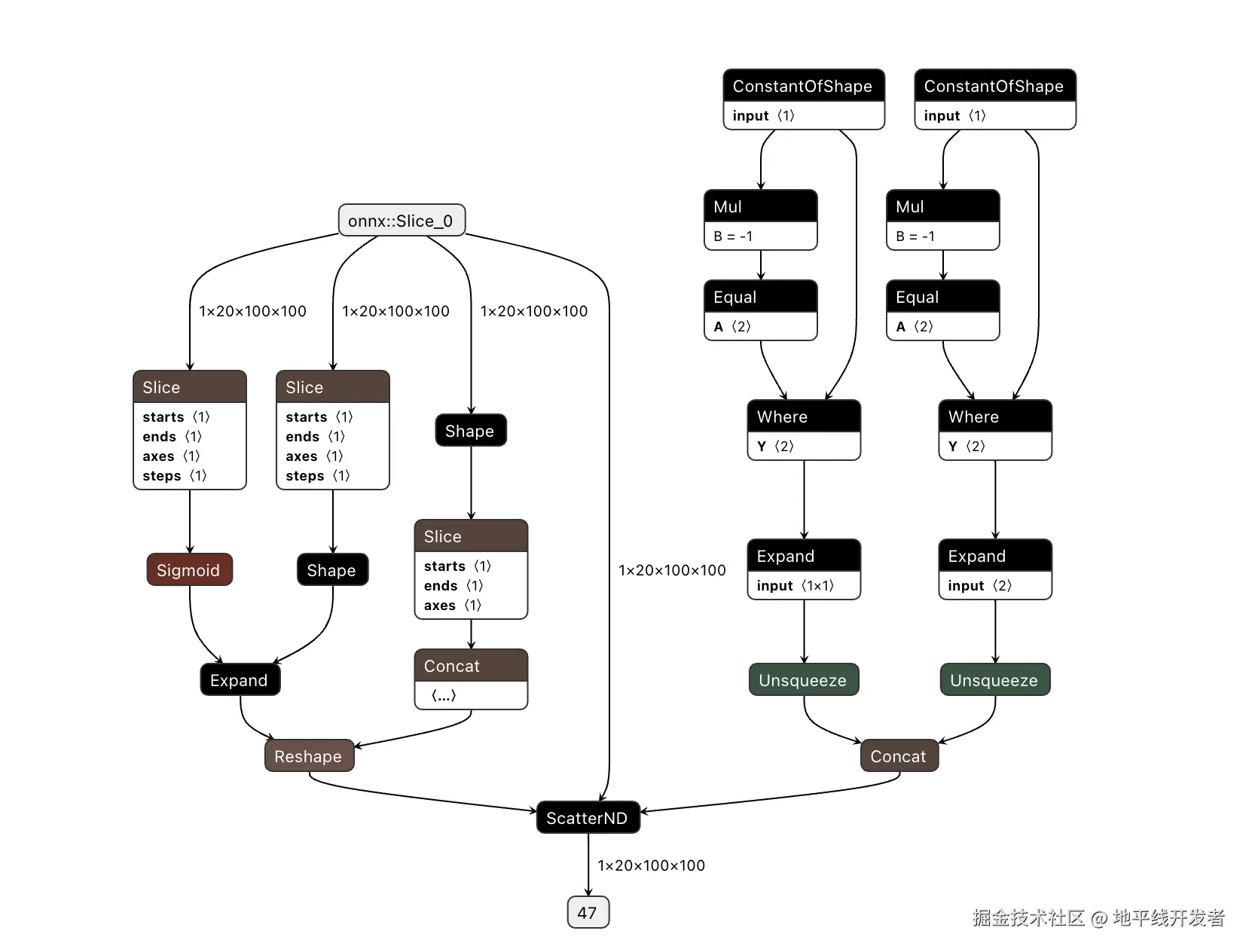 ScatterND 算子由 op 做了 slice 操作 之后 又进行 inplace 产生,因此会引入 CPU 算子。若导出的 onnx 中均存在大量 ScatterND,希望从算法侧进行移除, 等价替换相关操作即可。以下给出几种使用场景: