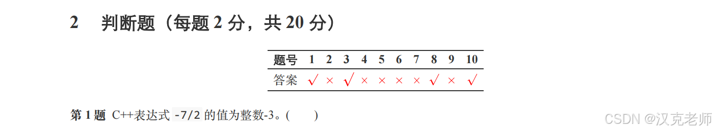 1、C++表达式 -7/2 的值为整数 -3。( )