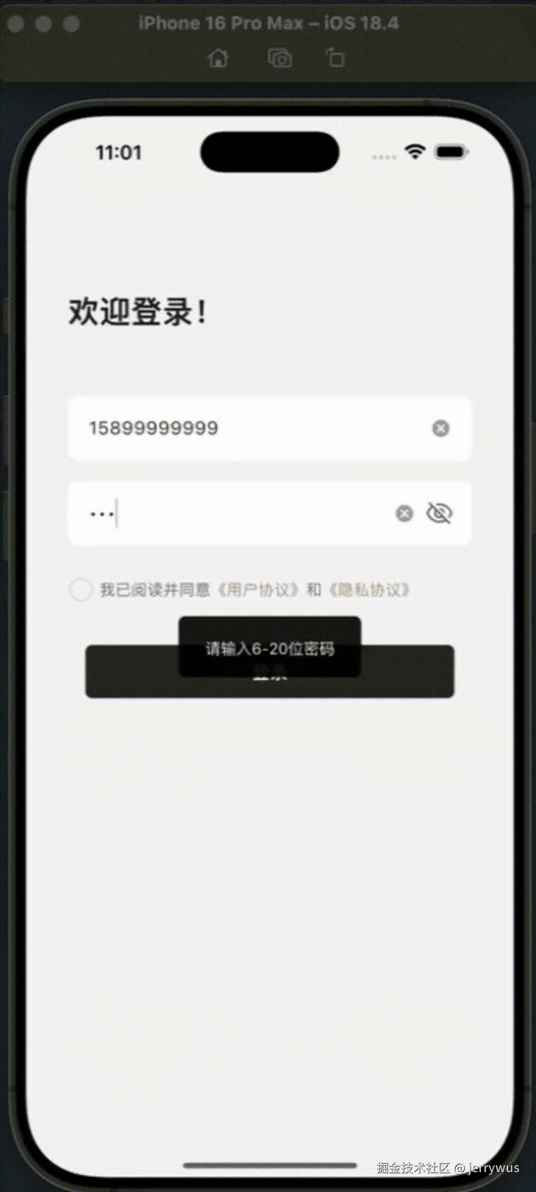 | TC-04 | 密码少于 6 位 | Toast "请输入6-20位密码" |