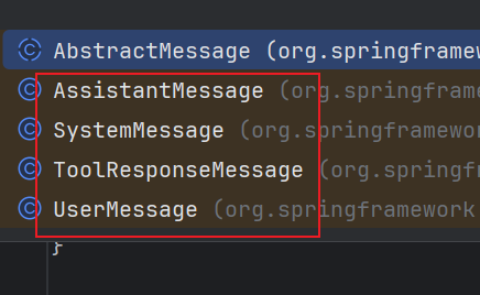 - Message 就是对话内容的载体,它有多个实现类,对应不同的对话角色: