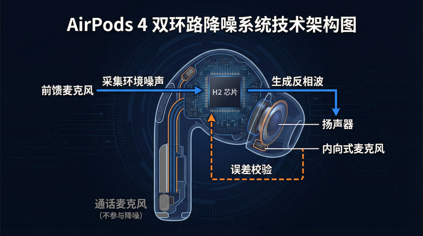 这就是"外采 + 内校"------前馈负责"估计",内向式负责"纠错"。有趣的是,AirPods 4 标准版和降噪版的核心硬件差异,就是那颗外侧的前馈麦克风。少了它,整个闭环就断了。一颗麦克风的有无,决定了产品能力的质变。