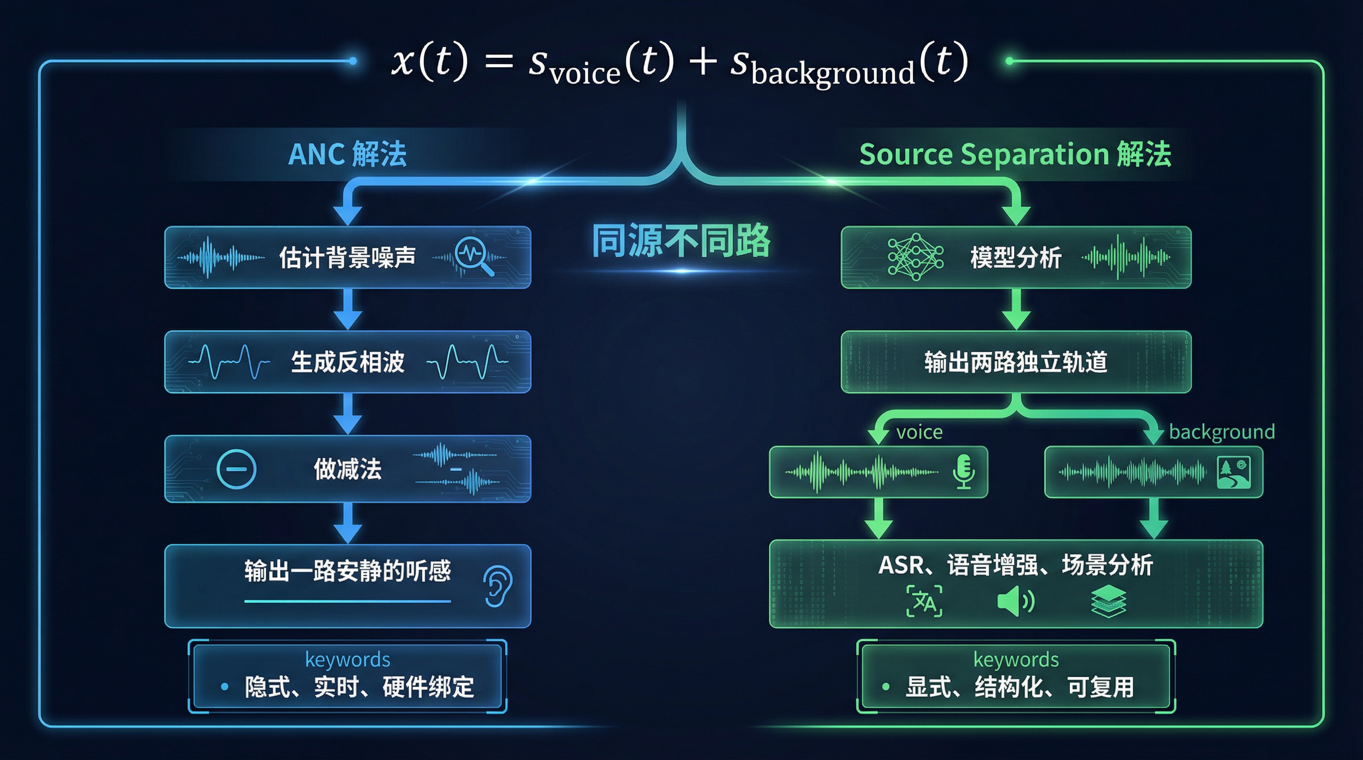 - 不同的工程路径:ANC 用硬件闭环换极致低延迟,走隐式路线;Source Separation 用模型换信号结构化,走显式路线
